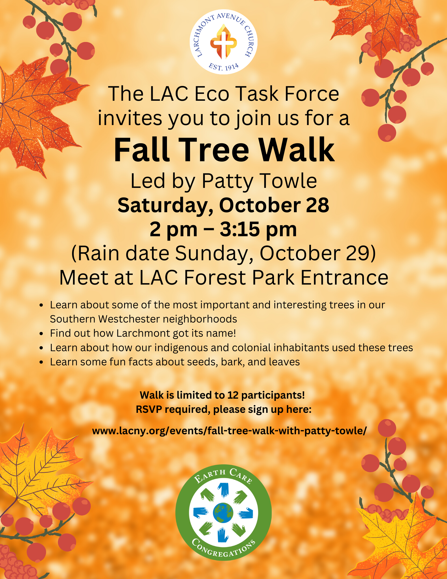Fall Tree Walk with Patty Towle Saturday, October 28 2:00 pm - 3:15 pm Fall Tree Walk with Patty Towle