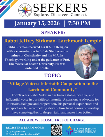 We are thrilled and honored to feature Rabbi Jeffrey Sirkman from the Larchmont Temple to kick off our 2026 SEEKERS series: “Village Voices: Interfaith Cooperation in the Larchmont Community.” Rabbi Sirkman, an influential voice in our community for 38 years and a long-standing passionate advocate for interfaith dialogue and cooperation, will bring his personal experiences and perspectives to tell a compelling story of how local houses of worship have come together to deepen faith and strengthen our community.